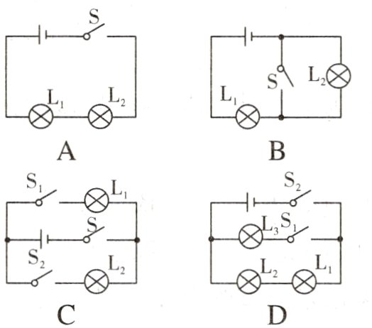 7. 如图所示,开关S、$S_1$、$S_2$都闭合时,灯泡$L_1$与$L_2$组成并联电路的是 ( )