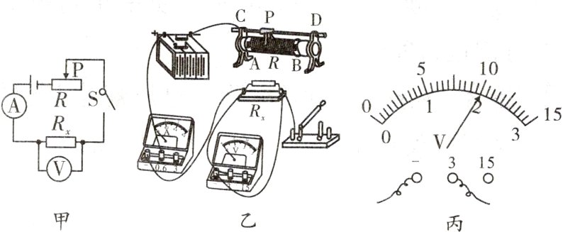 (4)排除故障后,闭合开关S,当滑片P移动到某一个位置时,电流表的示数为0.2A,电压表的示数如图丙所示,其读数为________V,则待测电阻$R_{x}=________Ω。$小宇同学提出应该多次改变滑片P的位置,读出多组数据进行计算,这么做的目的是________