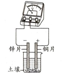 3. 某校研究性学习小组的同学,在网上浏览到一条信息:“微生物燃料电池”能利用土壤中的电解质获得电能,供给某种灯发光,受此启发,他们用潮湿的土壤、铜片、锌片等制成了一个“土壤电池”,并测出有一定的电压,如图所示。那么“土壤电池电压的大小与哪些因素有关?”他们提出了以下猜想: