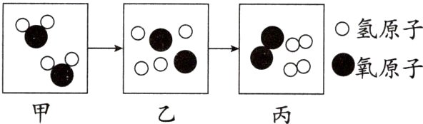 解析 甲为水,甲中的微粒为水分子,水是由水分子构成的,水分子能保持水的化学性质,故A说法正确;原子是化学变化中的最小微粒,原子在化学变化中不变,乙中微粒为氢原子和氧原子,在化学变化过程中没有发生改变,故B说法正确;丙中的物质为氢气和氧气,是由两种物质组成的,属于混合物,故C说法正确;水通电分解生成的氢气和氧气的体积比为2:1,故D说法错误。