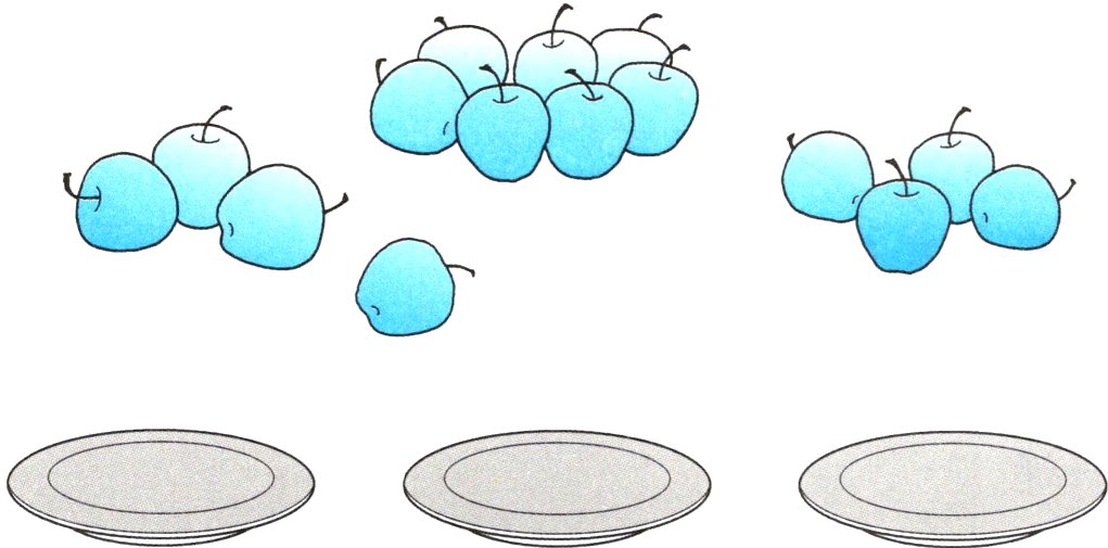 一共有( )个苹果,( )个盘,平均每个盘里装几个苹果?
