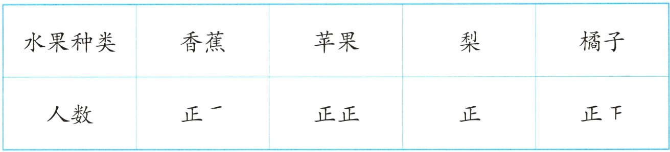 2. 二(1)班同学最喜欢吃的水果的调查情况如下表。
