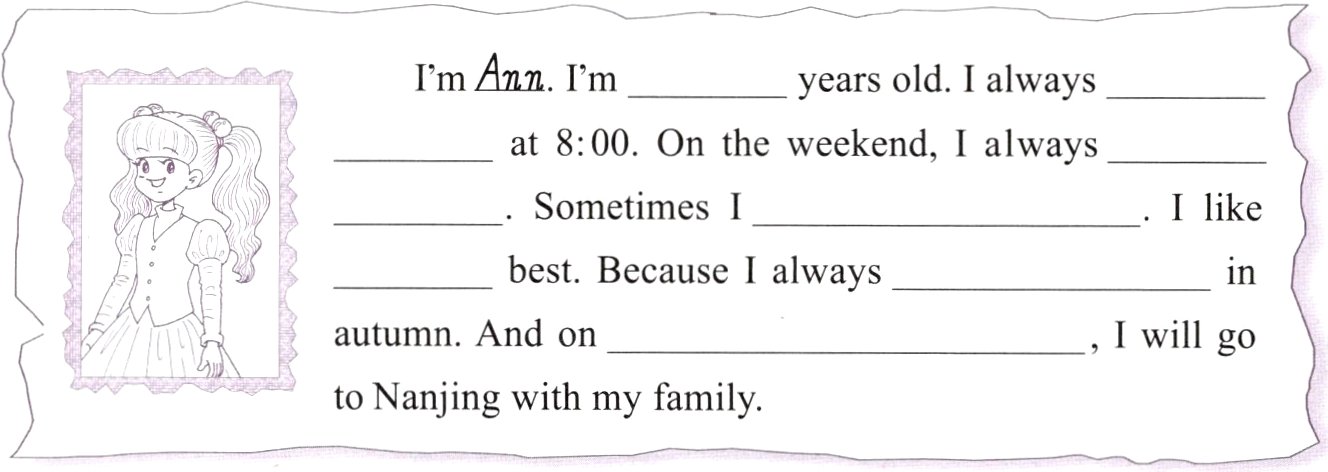 I’m Ann. I’m ________ years old. I always ________ ________ at 8:00. On the weekend, I always ________ ________. Sometimes I ______________. I like ________ best. Because I always ______________ in autumn. And on ______________, I will go to Nanjing with my family.