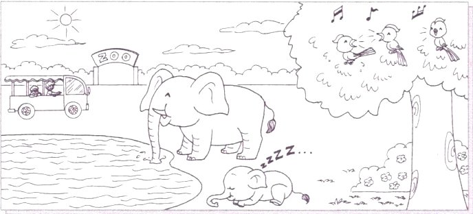 I go to the zoo with Mike in the ______. We see many animals. The mother elephant is ______ water with its ______. The baby elephant is sleeping. There are birds in the trees. They are ______ songs. I ______ they are happy.