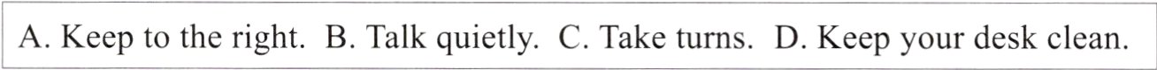 A. Keep to the right. B. Talk quietly. C. Take turns. D. Keep your desk clean.