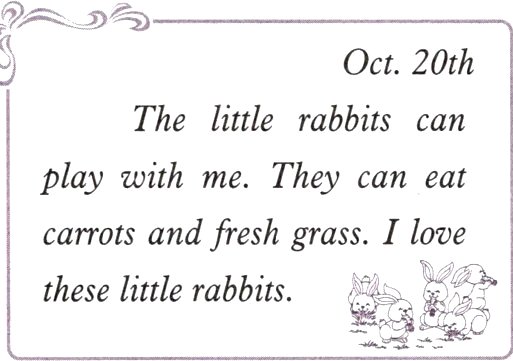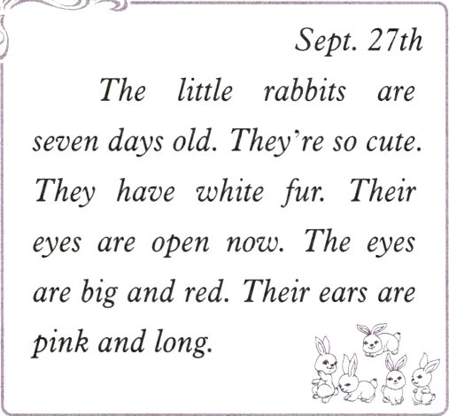 My grandpa has five new little rabbits. They are pink. They still can’t see. They make noises when they are hungry. They like milk very much.
