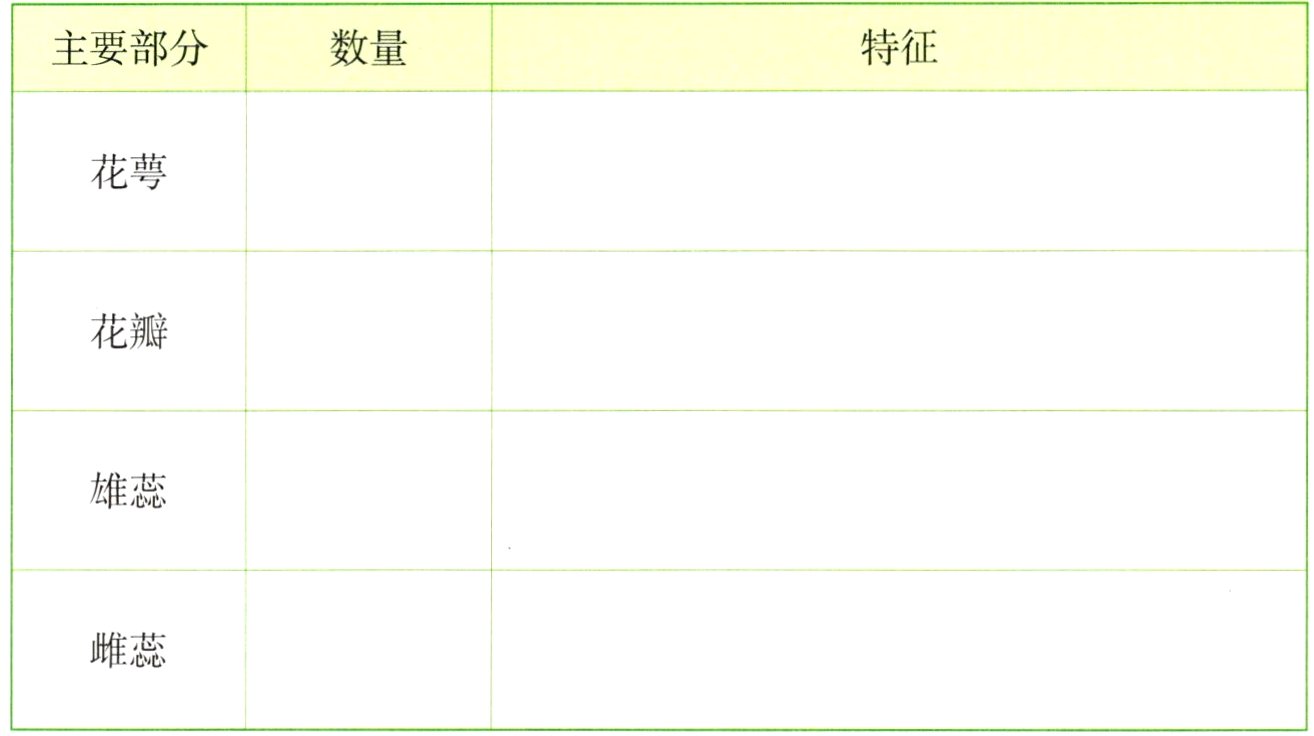 1. 观察并解剖一朵油菜花,把观察结果用简图和文字记录在下表中。