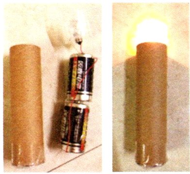 5. 往下按量杯,使灯泡与电池连接,灯就亮了;把量杯拉起,电路断开,灯就灭了。这样,一个简易的手电筒就做好了。