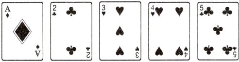 3. 下面5张扑克牌上的点数,经过怎样的运算才能得到10?你能想出几种方法?试着写出来。