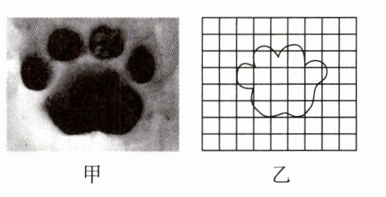11. [2024·北京] 近年来在东北林区发现了越来越多野生东北虎的足迹。生物学家为了估算某只野生东北虎的质量,在松软、平坦且足够深的雪地上,选取该东北虎四脚着地停留时的脚印,其中的一个脚印如图甲所示。在方格纸上描绘出脚印的轮廓,如图乙所示,图中每个小方格的面积均为 9 cm²,数出脚印轮廓所围小方格的个数(凡大于半格的都算一个格,小于半格的都不算),用数出的小方格的个数乘一个小方格的面积,就大致得出了脚印的面积。测出脚印的深度,在脚印旁边相同的雪地上放一底面积为 100 cm² 的平底容器,在容器中缓缓放入适当的物体,当容器下陷的深度与脚印的深度相同时,测出容器及内部物体的总质量为 30 kg。忽略脚趾和脚掌之间空隙的面积,$g$ 取 10 N/kg,求: