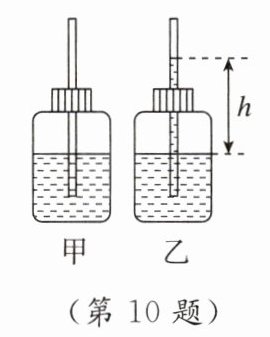 10. [2023·西藏] 卓玛学习了大气压强之后,用密度为ρ的液体自制了气压计,气压计放在一楼时,细玻璃管内外液面相平,如图甲所示,她乘坐电梯到达顶楼时,细玻璃管内液面上升的高度为h,如图乙所示。液面上升的原因是随高度的增加,大气压强变________;已知到达顶楼时瓶内气压为p,请你用题中的物理量符号表示顶楼的大气压强p0=________(结果还需用到符号g)。