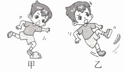 13. 小刚同学放学回家的路上,脚被石块绊了一下,身子向前跌倒(图甲)。继续行走一会,不小心脚踩到一块西瓜皮,身子向后摔倒(图乙)。对这两种情景,图甲情况中,小刚_______的运动状态改变,而_______由于惯性仍保持原来的运动状态;图乙情景中,小刚_______的运动状态改变,而_______由于惯性仍保持原来运动状态。(均填“上半身”或“脚”)