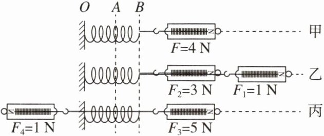 3. [2024·龙岩新罗区校级月考] 某中学初二年级同学在探究同一直线二力合成的实验中,把一根轻质弹簧的一端固定在$O$点,另一端用尼龙细线固定在弹簧测力计的挂钩上,每次实验时,他们都将弹簧由$A$位置拉伸到$B$位置。探究过程及实验数据如图甲、乙、丙所示,请仔细观察图中的装置、操作及现象,然后归纳得出初步结论。