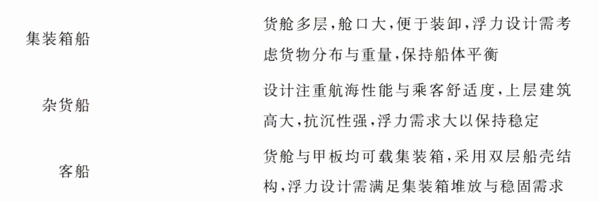 货舱多层,舱口大,便于装卸,浮力设计需考虑货物分布与重量,保持船体平衡@@设计注重航海性能与乘客舒适度,上层建筑高大,抗沉性强,浮力需求大以保持稳定@@货舱与甲板均可载集装箱,采用双层船壳结构,浮力设计需满足集装箱堆放与稳固需求