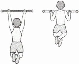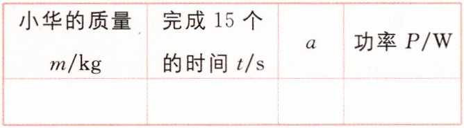9. 新考法 实验设计 引体向上是同学们经常做的一项健身运动,如图所示,该运动的规范动作是两手正握单杠,由悬垂开始,上提时,下颚要超过杠面;下放时,两臂放直,不能曲臂。这样上拉下放,重复动作,达到锻炼臂力和腹肌的目的。课外活动时,小华同学连续做了 15 个规范的引体向上,小组的同学们设计了以下表格,并测量一些物理量估测小华同学做引体向上时的功率。