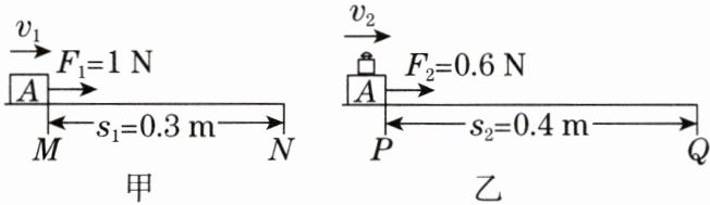 8. [2023·广州] 物体$A$重 5 N,如图甲所示,$A$在水平拉力$F_{1}$作用下,在水平面从$M$匀速直线运动到$N$用时 3 s;如图乙所示,在$A$上放置一个砝码,$A$在水平拉力$F_{2}$作用下,在另一水平面从$P$匀速直线运动到$Q$用时 2 s。