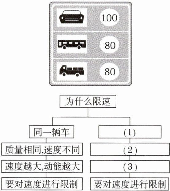 13. 母题 教材P244T3 如图所示的是交通限速标志牌。为什么要对机动车的行驶速度进行限制?为什么在同样的道路上,对不同车型限制的车速不一样?请你补充完整下面的对比分析图: