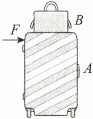4. [2023·凉山州] 车站广场上,常常看到人们将旅行包放在拉杆箱上,如图所示,若地面和拉杆箱$A$的上表面均水平,拉杆箱$A$和旅行包$B$在水平推力$F$的作用下,一起向右做匀速直线运动,不计空气阻力,下列分析正确的是( )