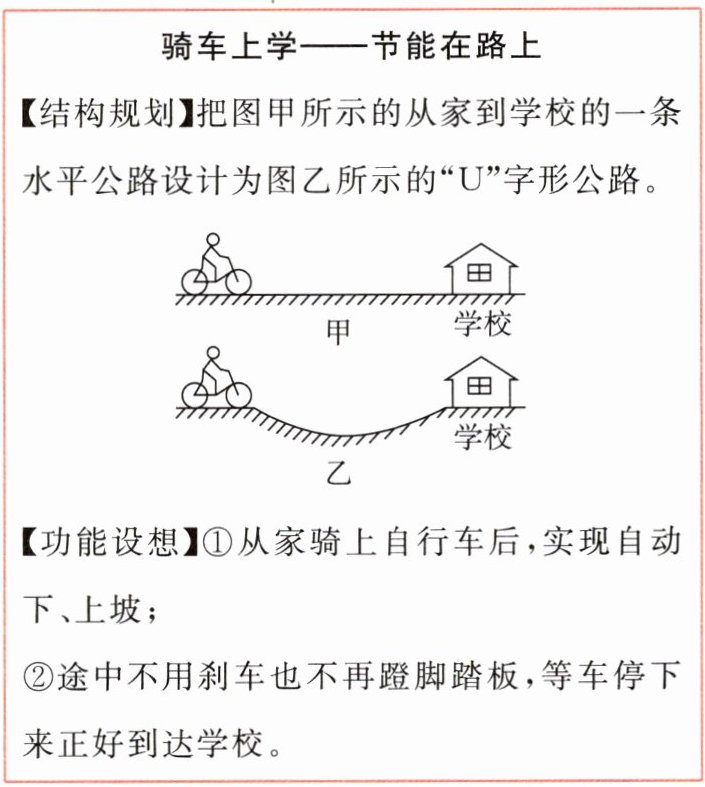 【功能设想】①从家骑上自行车后,实现自动下、上坡;②途中不用刹车也不再蹬脚踏板,等车停下来正好到达学校。