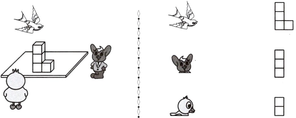 2. 笑笑用积木搭了一个立体图形,如下图。看一看,把你从正面、侧面、上面看到的形状分别在方格纸上画出来。