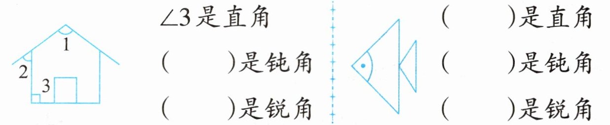 3. 标出一个直角、一个锐角和一个钝角,并填一填。