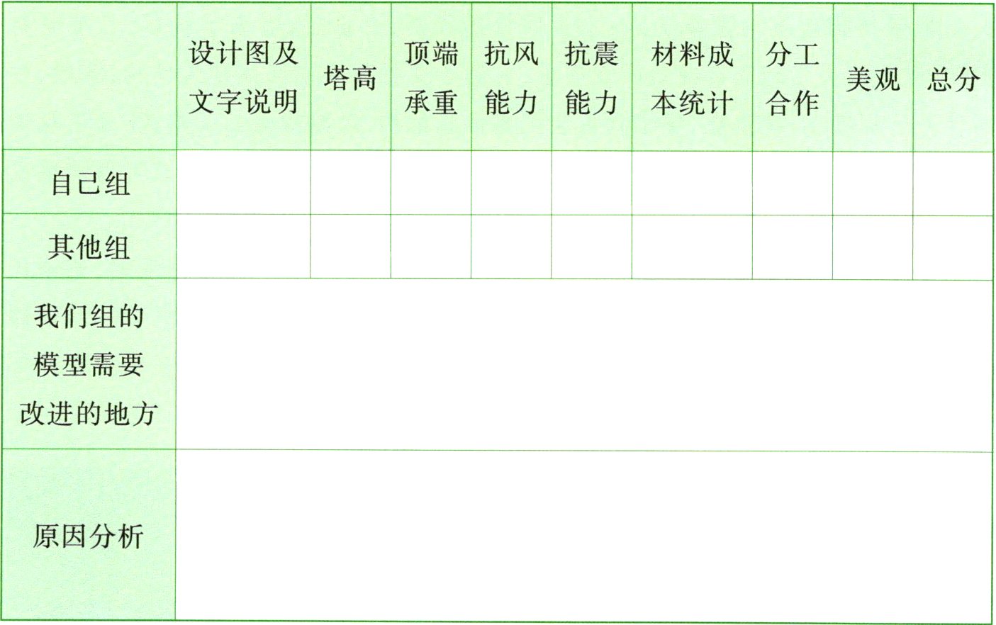 根据教科书第11页的制作评价表,完成下面的塔台模型测试记录表,并分析。(每项最高3分)