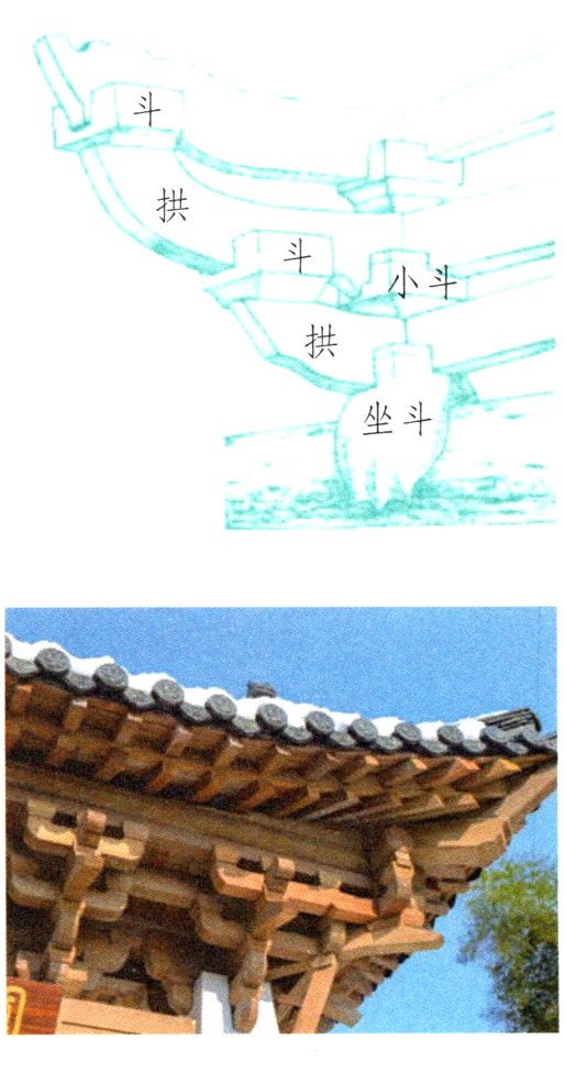 那么,故宫保持不倒的秘密是什么呢?答案是斗拱。有人说,中国传统木质结构建筑中,最简单的组合是斗拱,但技术最复杂的也是斗拱。它有多复杂呢?工匠们将拱架在斗上,向外挑出,拱端之上再安斗,拱托着斗,斗托着拱,就像搭积木一样,一层层交错叠加,托着屋檐往外延伸。斗拱之所以这么厉害,在于它不需要一颗钉子,也不用胶水,靠着榫卯结合,就能牢固地组装在一起,像一个结构精巧的支架。它们层层伸展,扩大了横梁的着力面积,将屋顶的重量传给了立柱。