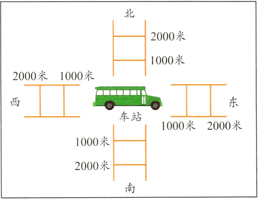 2. 一辆汽车从车站出发,向东行驶,因发生故障停在离车站1500米的地方。请用圆点在图中标出汽车的位置。