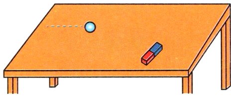 如果像右图那样,在桌面上放一块磁铁,小钢珠的运动方式将会是怎样的?