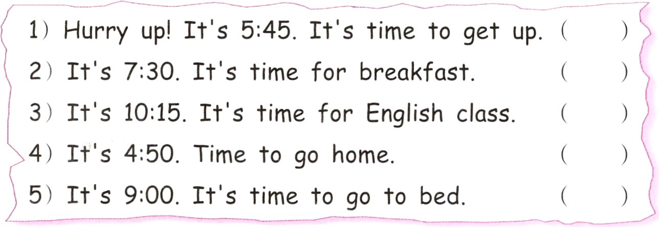 1) Hurry up! It's 5:45. It's time to get up. ( )