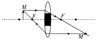 12. “天宫课堂”在中国空间站精彩开讲并向全球直播,其中的“水球透镜”实验给人们留下了深刻的印象——通过带气泡的水球看到的竟然是一正一反两个像!经过仔细比对加气泡前后的成像现象,同学们推测:如果把凸透镜的中间部分遮住,也应该可以成像。请在图中画出M点的成像光路图。