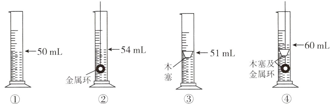11. 如图是小华测量木塞体积的实验(木塞单独放入水中无法下沉),由图可知木塞的体积是________cm³(以量筒右侧标出的数值为准),其中四个步骤中不需要的是________(填序号)。