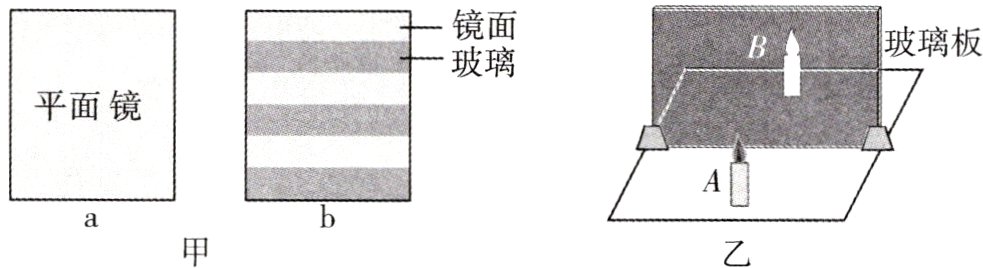 (1) 第一小组找到如图甲所示的两种器材,器材a是平面镜,器材b是在薄玻璃板的一面贴上几条镜面纸的自制教具,应选择器材________(写出器材的字母符号即可)做实验,选择它的目的是____________________;