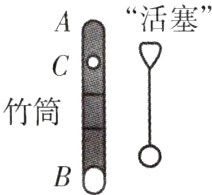 7. 如图所示是一手工艺品,由竹筒(AB两端开口、C处开一小口)和“活塞”组成,将活塞从B处塞入,在A处吹气并来回拉动“活塞”能发出悦耳的哨音,哨音主要是由________振动发出的,通过________传入人耳;换用更大的力吹气,改变了哨音的________(选填“响度”“音调”或“音色”),要使哨音音调升高,可以________(选填“向上推”或“向下拉”)活塞。