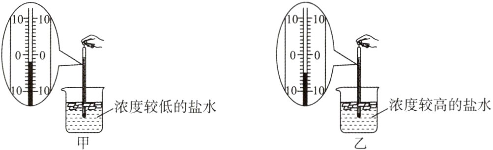 [解析]由图可知,温度计的分度值为 1℃,且温度在零刻度以下,因此甲中温度计读数为 -2℃,乙中温度计读数为 -5℃。由甲乙两图的实验现象,浓度较高的盐水在更低的温度下凝固,证明盐水的浓度越高,其凝固点越低。