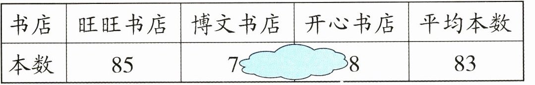 76 88 提示:用平均数乘数据个数就是数据总数,用数据总数减去旺旺书店售出的85本,就是博文书店和开心书店售出的总数,83×3 = 249(本),249 - 85 = 164(本),164 - 78 = 86,可知看不清楚的两个数字中十位上的数字是8,个位上的数字是6。所以博文书店一天内售出76本,开心书店一天内售出88本。