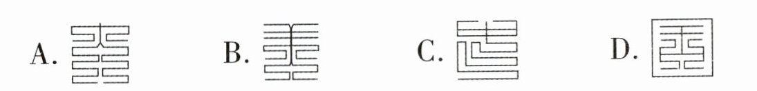 1. 新情境人文历史2024年春晚主标识以“龘”字为主视觉符号,整体设计以中国传统篆刻艺术中极具特色的“国朝官印”字体——九叠篆为灵感来源。下面四个九叠篆体字“大”“美”“中”“国”中,不是轴对称图形的是( )。