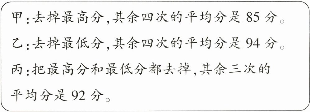 4. 教材思考题变式数学老师在黑板上写了“小明五次单元考试的成绩”,同学们自由提问并解答,三位同学做了如下的解答,并且他们都是答对的。你知道小明五次单元成绩平均分是多少分?(8分)