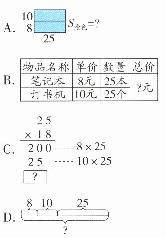 3. 新趋势 算理理解 在下面情境中,不能解释“(8+10)×25 = 8×25+10×25”的是( )。