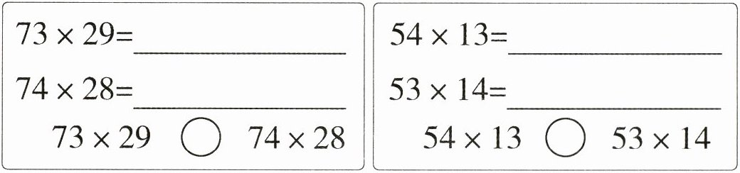 (2) $73×28 + 73$;$73×28 + 28$;$>$;$53×13 + 13$;$53×13 + 53$;$<$