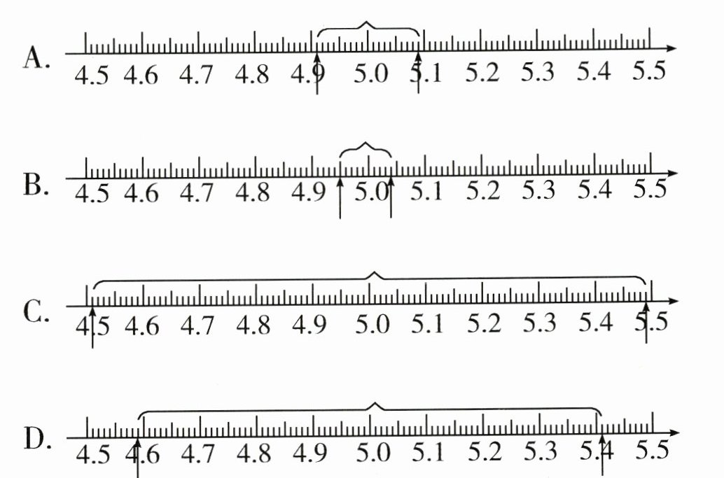 5. 新素养 数感 一个两位小数精确到十分位是5.0,图中能正确表示这个两位小数取值范围的是( )。