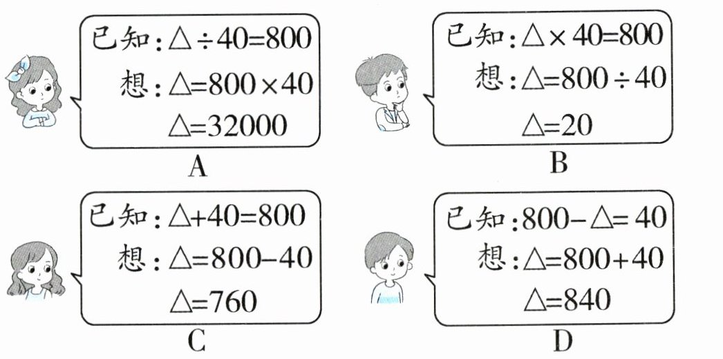5. 新趋势 评价说明 根据加、减、乘、除法各部分之间的关系求$\triangle$,下列方法错误的是( )。