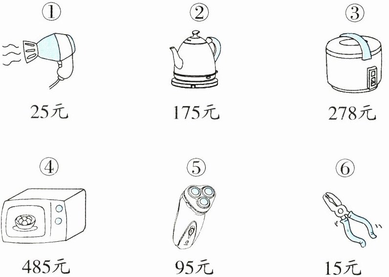 1. 王阿姨买了下列商品中的四种,价格的总和正好是整百元,她买了哪四种商品?共花了多少元?(5分)