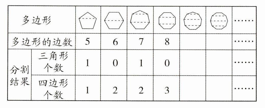 (2)照这样的方法分割下去,十二边形中最多能分割成( )个四边形来计算内角和。(2分)