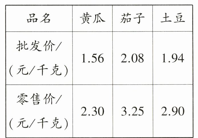 3. 爷爷批发了一些蔬菜去菜市场卖,当天每千克蔬菜的批发价和零售价如下。爷爷卖1kg黄瓜可以赚多少钱?卖1kg茄子比卖1kg土豆多赚多少钱?(6分)