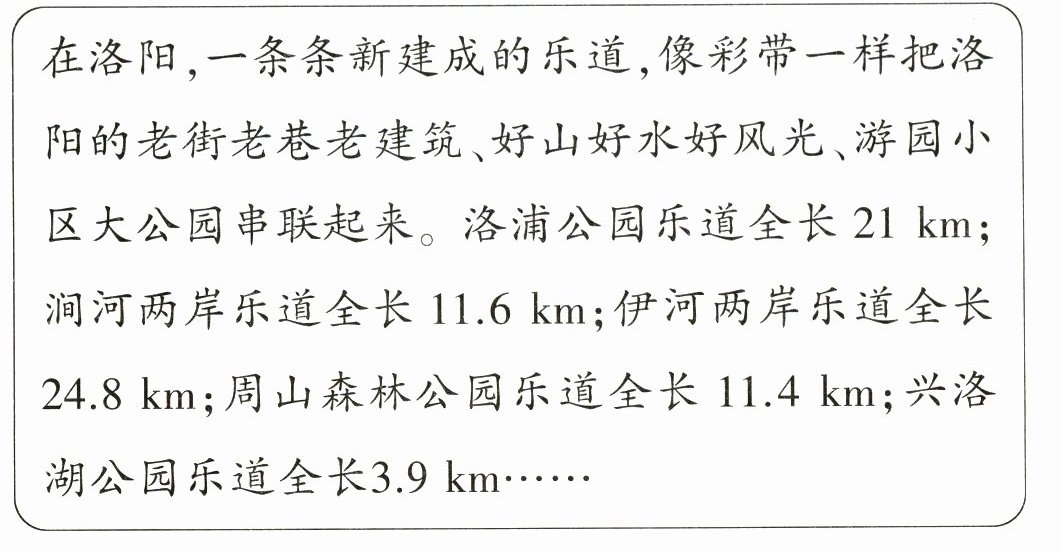 答案不唯一,如:洛浦公园乐道全长比涧河两岸乐道全长和周山森林公园乐道全长的和少多少千米?