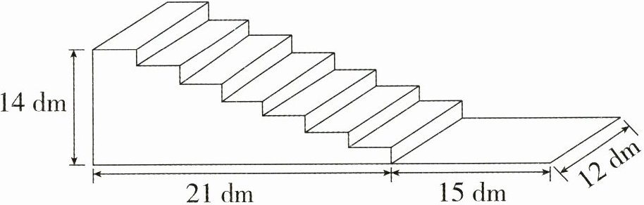 $(21 + 15)×12 = 432( dm^{2})$ $14×12 = 168( dm^{2})$ $432 + 168 = 600( dm^{2})$ 答:至少需要 600 $dm^{2}$ 的红地毯。