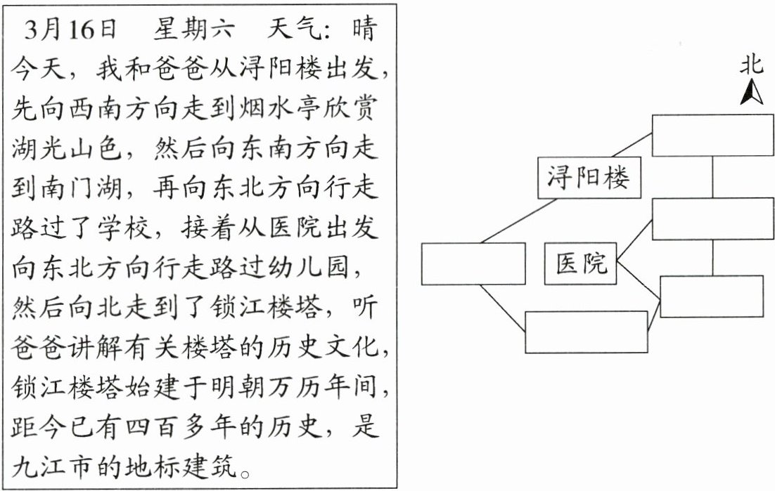 1. 新趋势 材料阅读 “浔阳江头夜送客,枫叶荻花秋瑟瑟。”出自白居易的《琵琶行》,浔阳是江西省九江市的古称。下面是琪琪去浔阳游玩后写的日记,请根据琪琪的日记把路线图填写完整。(10分)