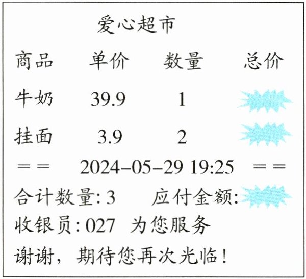1. 新情境 图表信息 如图是张阿姨去超市购物时的收银条,她不小心弄脏了。张阿姨一共花了多少钱?(5分)
