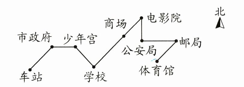 (1)市政府在车站的( )方向,商场在电影院的( )方向。邮局的西面是( ),少年宫在学校的( )方向。(4分)
